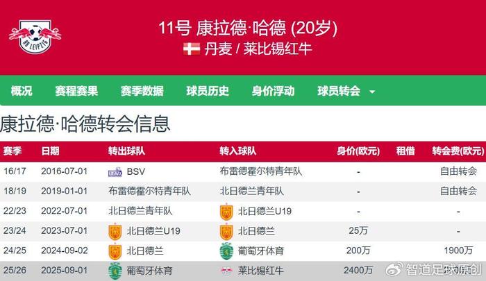 据德转数据显示,现年20岁的丹麦前锋哈德尔于9月1日以2400万欧元的转会费从葡萄牙体育加盟莱比锡。这位丹麦前锋将接过奥蓬达加盟尤文图斯离队后的11号球衣。